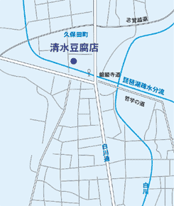 北白川通の一筋西、今出川通 沿いの疏水を渡ってすぐ、ラーメンで知られる「ますたに」のほど近くにある。南禅寺塔頭の聴松院はじめ周辺の寺院や料理屋にも納めていて、貴船のほとんどの料亭はお得意さんという。昭和35年の創業で現在2代目。国産とアメリカ産の大豆をブレンドして用い、凝固剤もニガリと硫酸カルシウムをほどよく使っている。