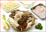 はじめにまこもたけと鶏肉を入れて少し炊き、次に他のきのこ類と豆腐を入れて炊きます。きのこ類は、火が通りすぎないように煮えばなを頂きます。好みで七味唐辛子、すだち又はかぼすの汁をふります。