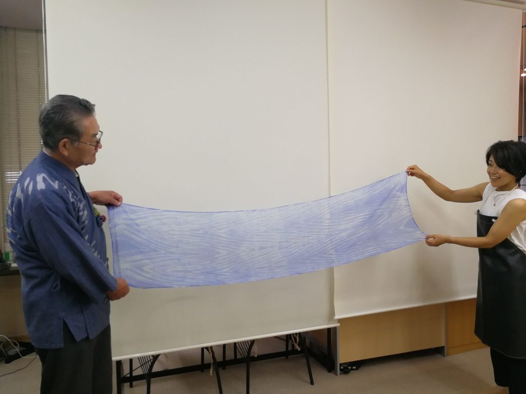 Ryo was kind to take time not only for the interview but he actually demonstrated one of their newly invented Kyo shibori techniques and allowed us to try and make a Kyo Arashi shibori scarf!!!