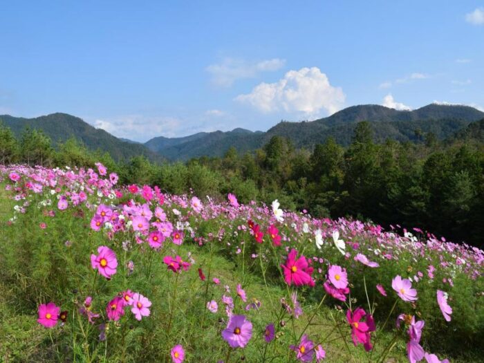京都洛西の自然の中を走る「嵐山ー高雄パークウエイ」のフラワーパークに、10月からコスモスが咲き誇る。5000平方メートルの敷地内にある山の斜面が一面のコスモス畑となり、撮影スポットとしても人気がある。日程の詳細は、パークウエイHPで確認のこと。