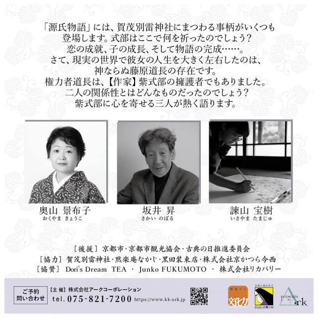 「源氏物語」には、賀茂別雷神社にまつわる事柄がいくつも登場します。式部はここで何を祈ったのでしょう? 恋の成就、子の成長、そして物語の完成……。 さて、現実の世界で彼女の人生を大きく左右したのは、神ならぬ藤原道長の存在です。権力者道長は、【作家】紫式部の擁護者でもありました。二人の関係性とはどんなものだったのでしょう? 紫式部に心を寄せる三人が熱く語ります。