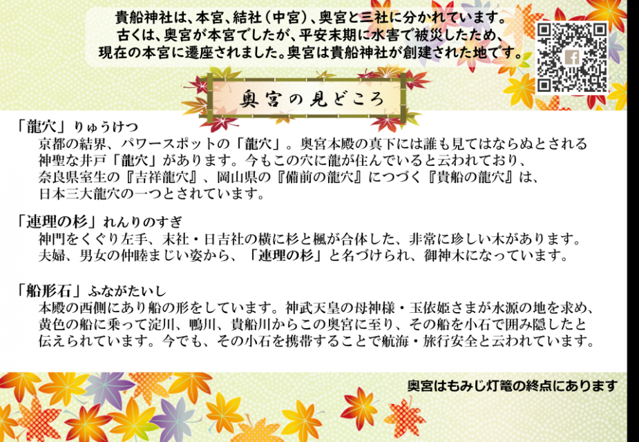 交通 | 叡山電車 出町柳駅 → 鞍馬線「貴船口駅」下車京都バス 貴船口駅前より「貴船」行きバス乗車、約5分、「貴船」下車 徒歩すぐ |