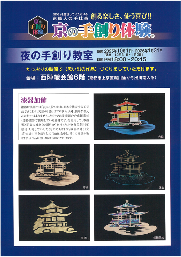 「夜の手創り教室」では漆の代表的な5技法から1技法を選んで頂き漆器素材装飾を施していただく「加飾」体験をして、ご自分の道具としてお使いいただく作品つくりをして頂きます。