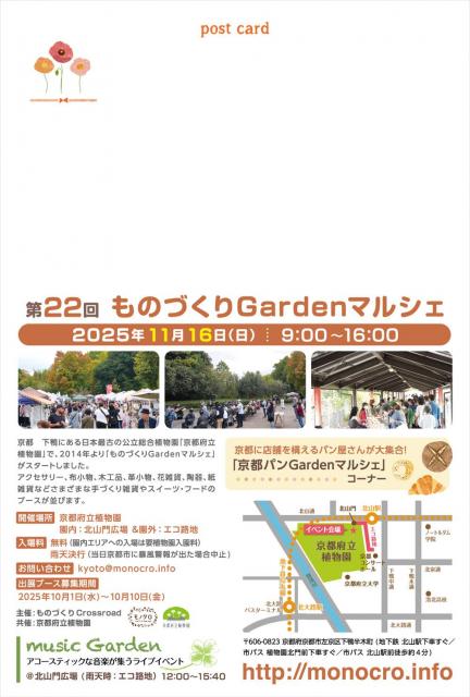 | 会場 | 場所	京都府立植物園 園内:北山門広場 / 園外:エコ路地 ※ music Garden 北山門広場 (雨天時:エコ路地) |
