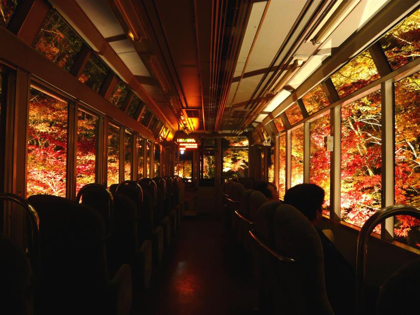 【コース】 出町柳駅==約30分==「もみじのトンネル」約3分停車(停まった列車から車窓を鑑賞)==鞍馬駅(折り返し)==二ノ瀬駅約5分停車(駅のもみじ鑑賞)==約25分==出町柳駅