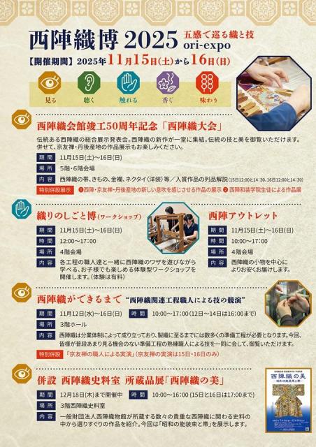 西陣織工業組合では、西陣織会館竣工50年を記念して、11月15日(土)・16日(日)の2日間「西陣織博2025 ~五感で巡る織と技~ ori-expo」を展開します。