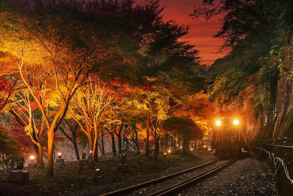 紅葉のライトアップとイルミネーション✨に包まれた山々や川の流れが、車窓を神秘的に照らし出し、まるで物語の中を進むような特別なトロッコ旅をお楽しみいただけます。