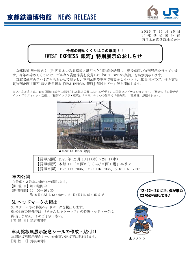 今年の締めくくりには、ブルネル賞優秀賞を受賞した「WEST EXPRESS銀河」を特別展示します。