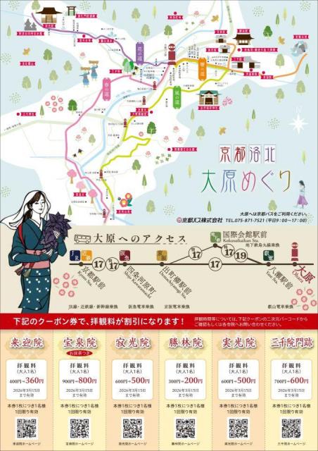 京都バス「大原」バス停にほど近い、三千院をはじめとした大原地域6社寺の拝観料割引クーポンが付いたチラシを京都バス車内や京阪電車主要駅およびプレミアムカー内などで配布いたします。
