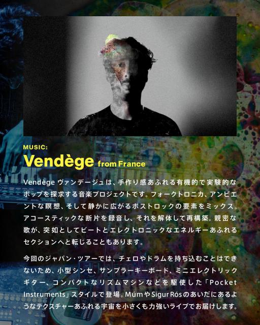 02.04[水]開催の「SIDE A」では、フランスより来日するティボー・マルシャルによる音楽プロジェクト ”Vendège”が、TIME PAINTINGの仙石彬人とのコラボレート。にしもとひろことイガキアキコによる「たゆたう」の因数分解プロジェクト”TAYUTAU KAITAI SHINSHO”がお出迎え。