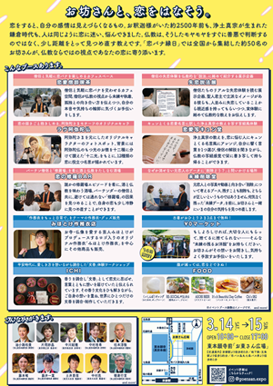 「恋」や「気持ちの伝え方」を意識するホワイトデー(3/14)から2日間、恋に悩める若者のために全国から総勢約50名の僧侶が集結。会場内に設置した喫茶スペースで僧侶に気軽に恋の相談ができる「恋愛僧談喫茶」の他にも、僧侶が自身の失恋エピソードから仏教の教えを語る「失恋説法展」、キュンと響く名言にアレンジした阿弥陀様の教えを栞に書き写す「写キュン堂」、誰かの修羅場エピソードを肴に酒と仏教をたしなむ「恋の修羅BAR」、元恋人の“データ”とお別れする葬儀場「未練データ葬」など、恋と仏教にまつわる様々な体験ブースを予定しています。