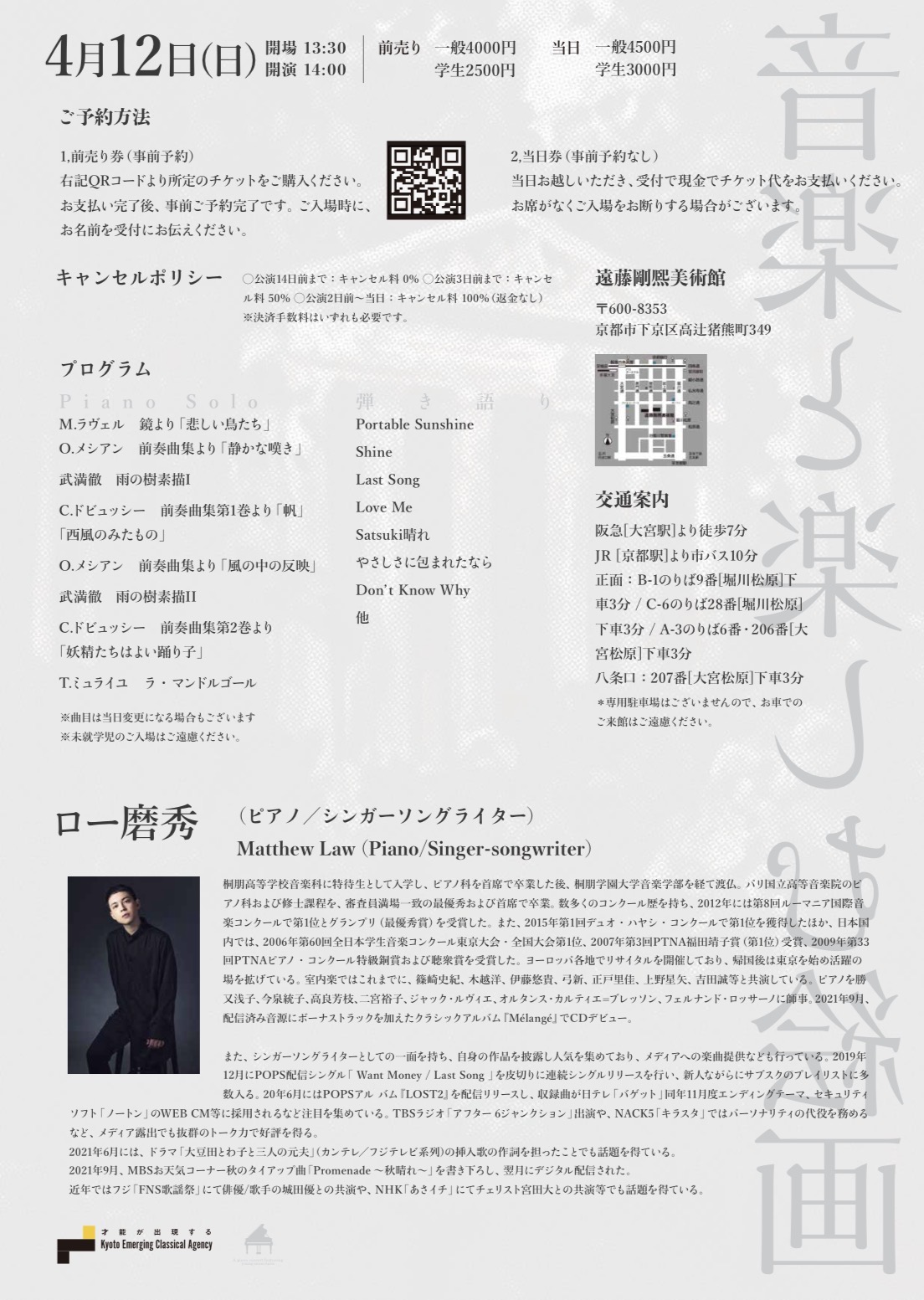 | 補足情報 | 主催者:kyoto Emerging Classical Agency ※チケット等詳しくはインスタグラムをご参照ください。 |