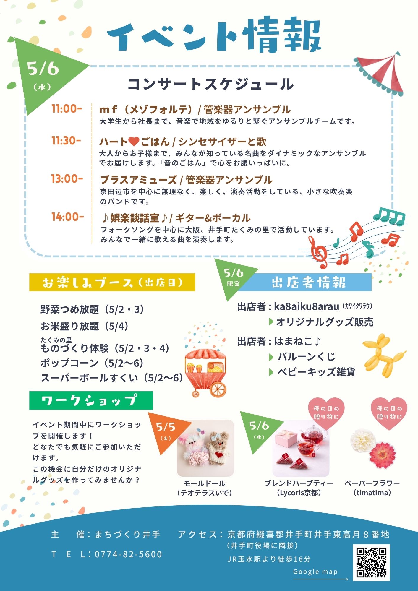 地元アーティストによるコンサートを開催。母の日ギフトにぴったりのワークショップや雑貨販売も行います。