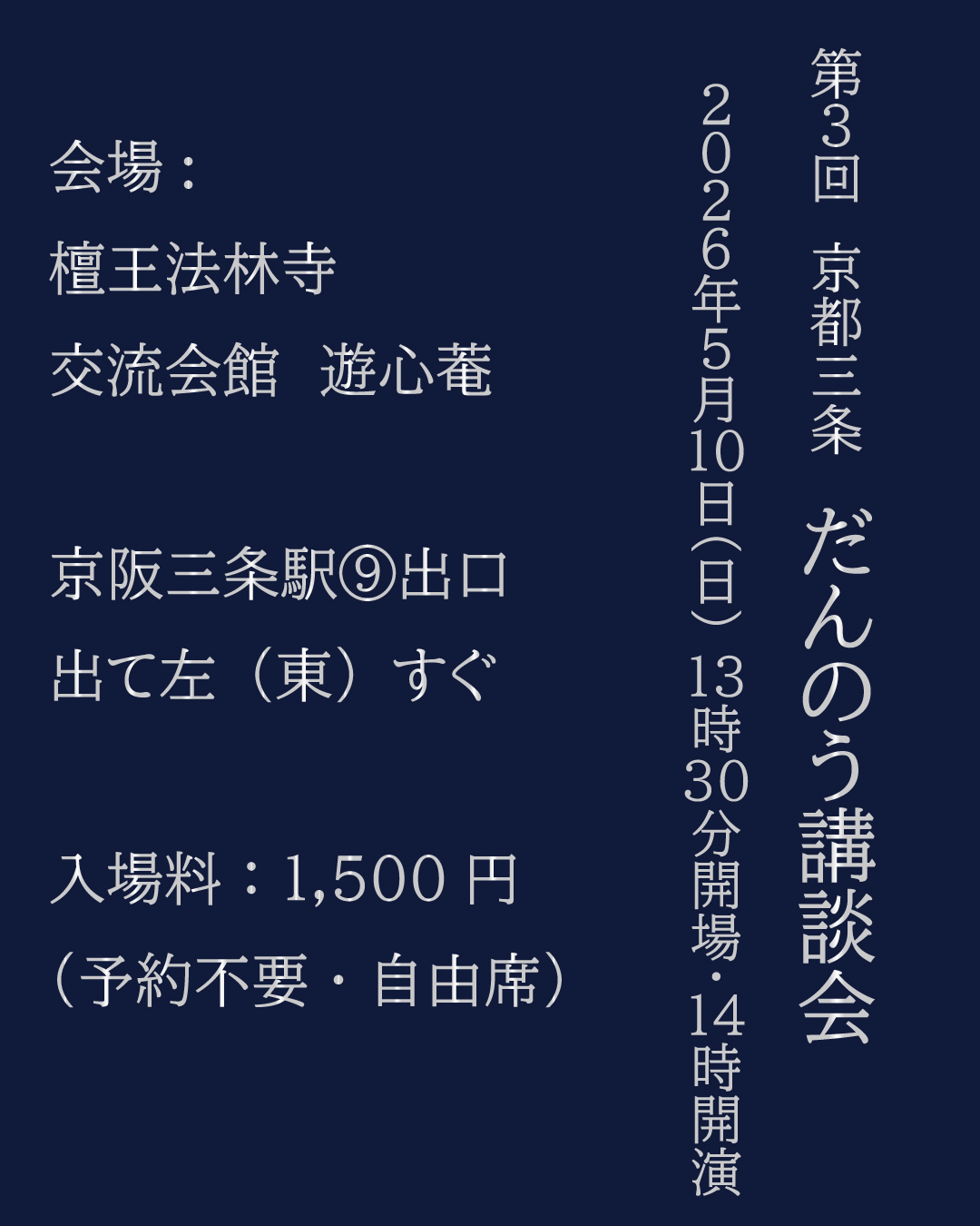 会場は京阪三条駅すぐの檀王法林寺交流会館「遊心菴」。好アクセスで予約不要ですので、ふらりとお気軽にお立ち寄りください!
