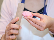 - 今回は「桜」と「蝶々」に挑戦! 職人さんが実際に作りながら説明してくれるから、まずは手順を確認。あっという間に出来上がってしまうから、職人さんの手元をよく見ておかないと。生菓子はスピードが命。乾燥するとひびが入るので、形づくりは素早く。