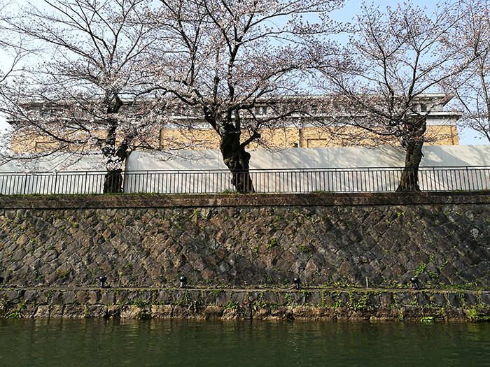 ただいま再整備工事中のため閉館している京都市美術館。石垣に落ちる桜の影が綺麗でした。