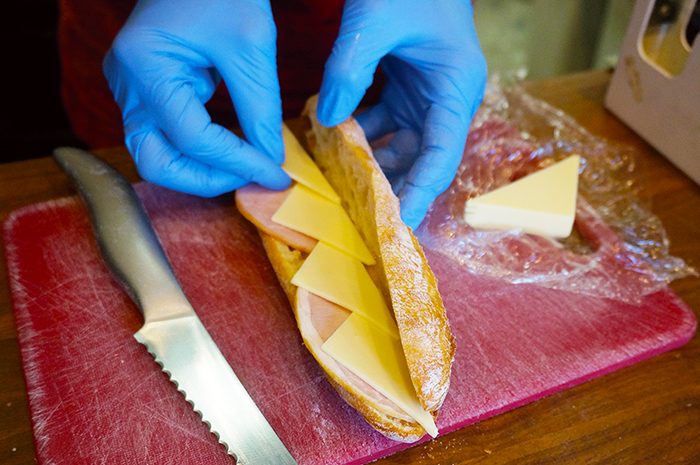 まさに、そのお手本のような「カスクート」(245円)を作るシーンを見せていただきました。石臼挽きの小麦粉を使ったフランスパンをザクッとカット。