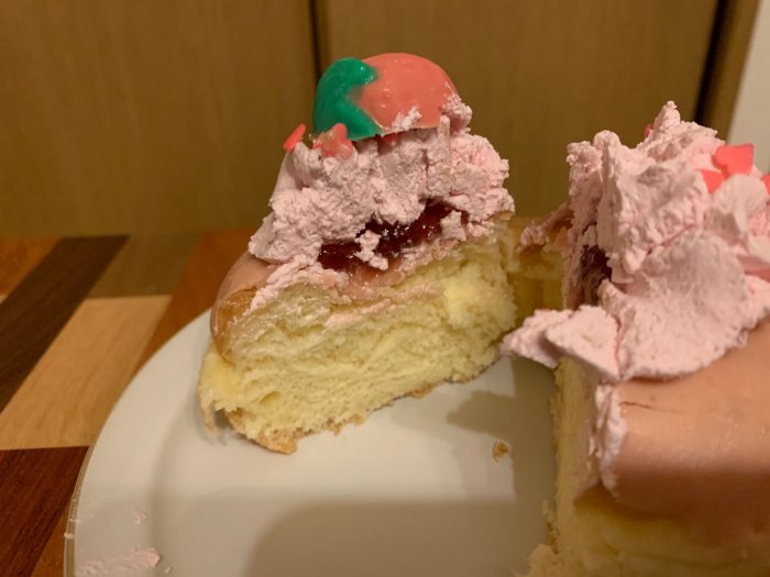 イチゴのクリームが甘酸っぱくて、中に入っているイチゴジャムと合わせてたべたら幸せです…