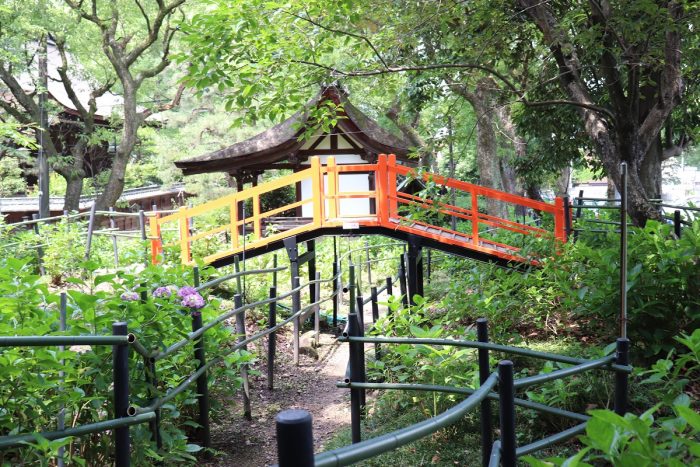 神社らしい、朱色の橋に紫陽花の紫が映えます。