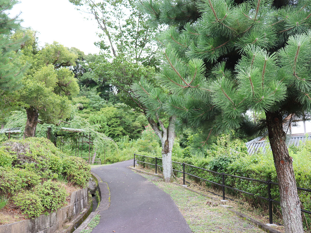 樹木や草花が多く落ち着いた雰囲気。階段の手すりやベンチも、お参りに訪れる方への配慮を感じます。