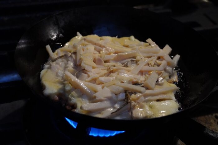 (1)タケノコは繊維に沿って千切りにし、5㎝くらいの長さにカットする。セリの根っこは半分に手で裂く