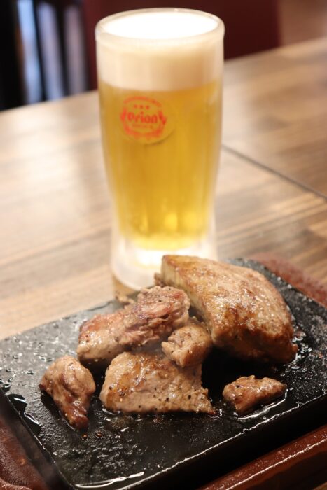 店長に聞くと、沖縄ではお酒の締めにステーキを食べる「締めステーキ」の習慣があるらしい。なのでお店には「沖縄ステーキ食堂」って冠までついてるんやって!へ~~!締めに肉とは、さすがやね!