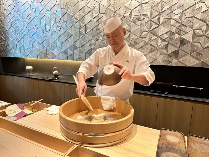 今日は内覧会という事もあって、「鮨 銀座おのでらフォーシーズンズホテル京都店」 料理長の久保卓弥さんが、目の前で酢飯を切っていただくパフォーマンスを披露!