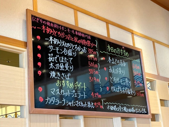 旬の魚や一品料理は、店内のおすすめボードでチェック!回転寿司ながら本格的な味わいが魅力