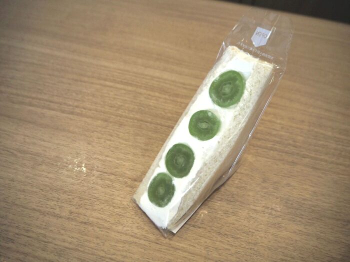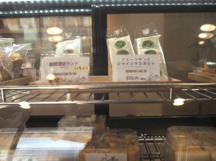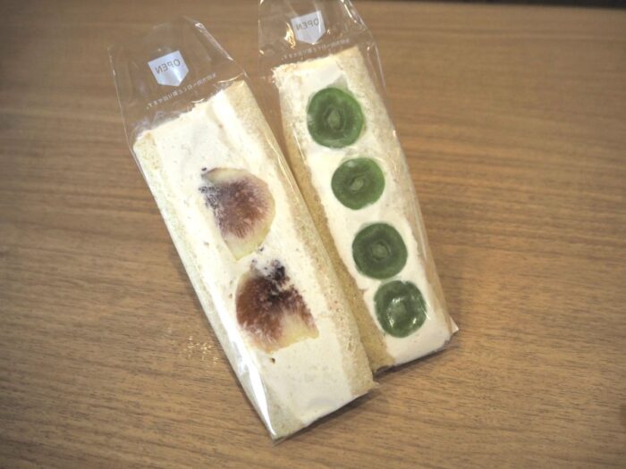 旬のフルーツを使用しているので、季節ごとに中身が変わり、取材で訪れた9月はシャインマスカット(650円)とイチジク(480円)が並んでいました。だいたい2~3種類のフルーツサンドが用意されています。