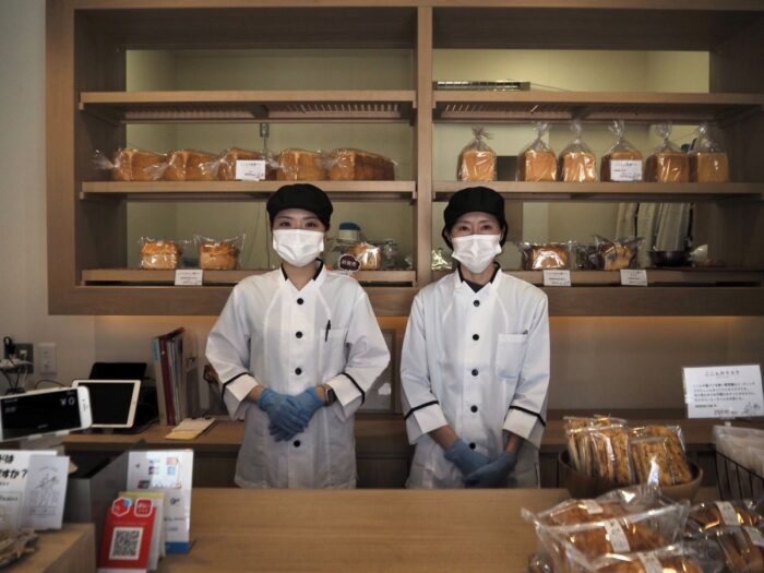 店内には専門店ならではの自慢の食パンが並び、香ばしい小麦の香りが漂っています。