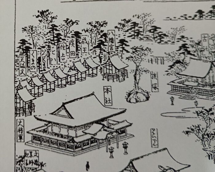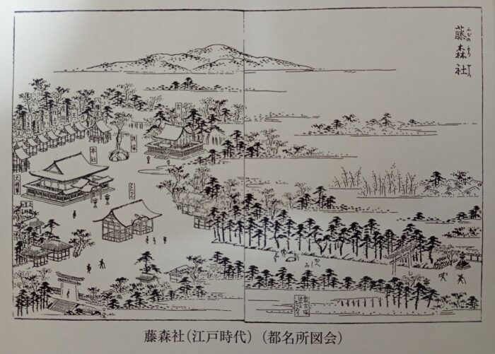 また七つの神社は、元の場所にあったときから一か所に集まっていたのか、それとも散在していたのかについても分かっていません。私はその地域に散在していたのではないかと思います。理由は、七つの神社が最初、藤森神社の境内に独立した七つのお社として造営されているからです。江戸時代に刊行された『都名所図会』の藤森神社を描いた部分にもその姿が見られます。