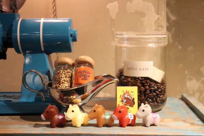 「スパイシーダービー」のロゴが描かれたカレーポットの中にはオリジナルのスパイス小瓶が!仔馬ちゃんたちと一緒に写せるフォトスポットのようなおしゃれ空間ができあがっていました。