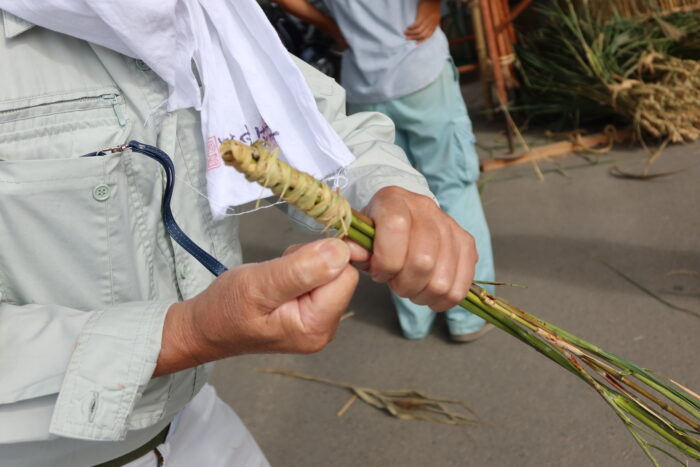 5本のススキの束をわらで巻いている様子。祇園祭・鷹山の理事である森さんが、わらの巻き方などの技術を惜しみなく伝授している姿に、祭りを超えた人のつながりを感じます。