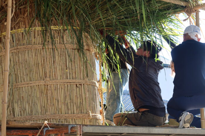 火除け用に宇治川に自生する水分を含んだススキを束ねて防炎シートの役割として使用します。