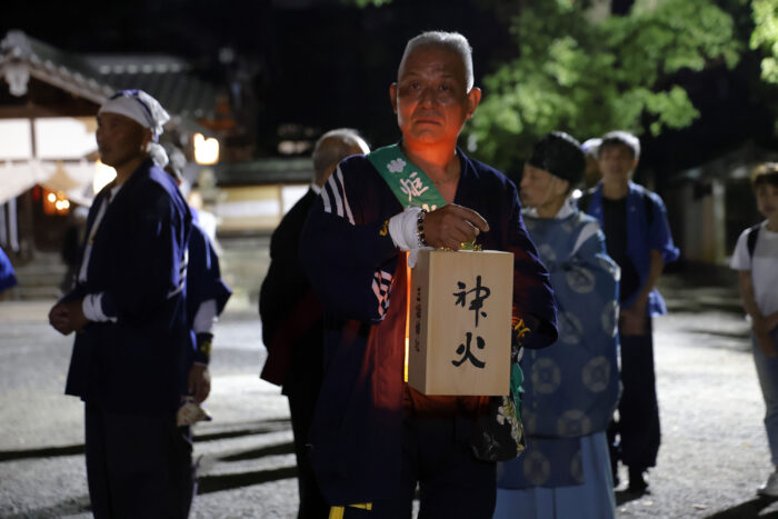 宮司による関係者へのお祓いが終わると、御旅所では「神火」という文字が書かれた箱を持った三栖神社祭礼実行委員会 炬火部長の林さんが炬火の到着を真剣な面持ちで待ちます。