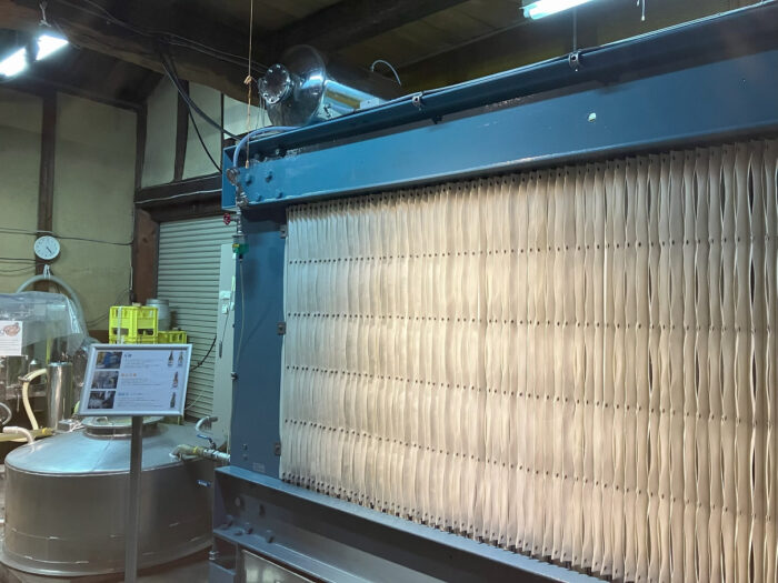 このカーテンの様な機械はお酒を絞り出す圧搾機。