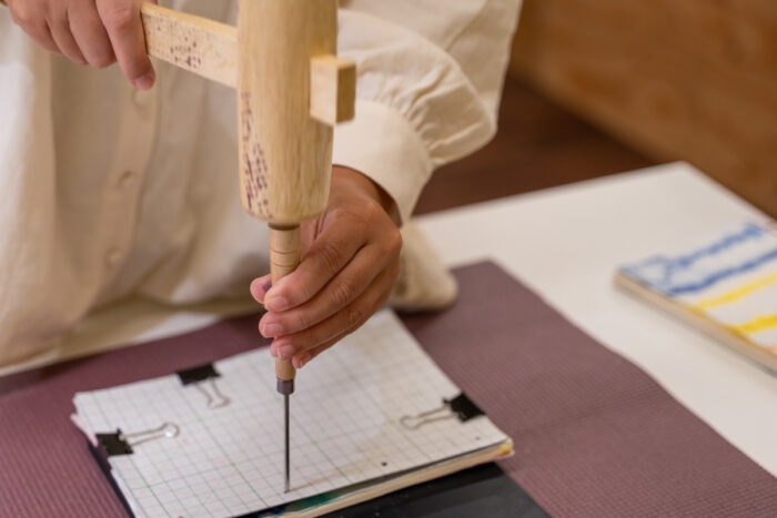 オリジナルのテンプレートに合わせて、きりと木槌で綴じ穴を開けます。力は不要ですが、集中力が試されます。