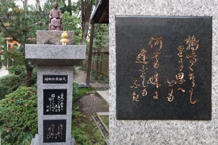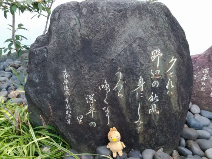 大伴家持のものは稲荷山にある伏見神宝(かんだから)神社、藤原俊成は茶碗子の井戸のところにあります。「鶉鳴く」は「古」に掛かる枕詞。ただし、大伴家持の歌に出てくる「古りにし郷」は、一般には奈良の都とされています。