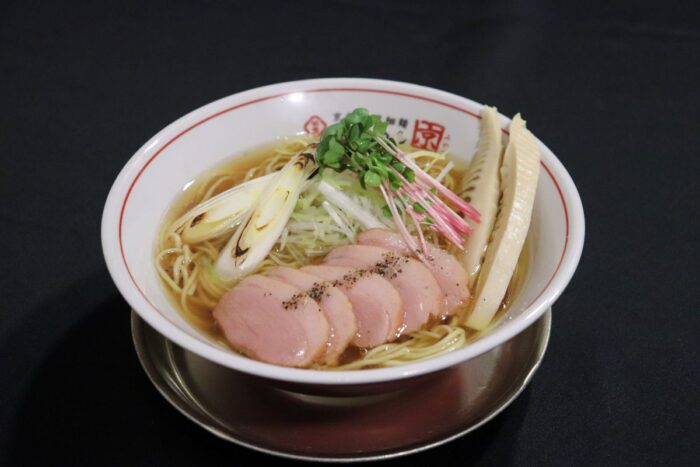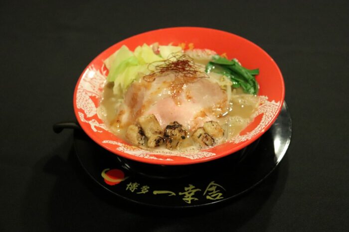 炙りもつの香ばしさとにんにくの効いたもつ鍋風スープ。キャベツ・もやし・ニラがたっぷり入り、糸唐辛子の赤が味も見た目も引き締める。“博多を旅する気分が味わえる一杯”の満足感をぜひ味わってみていただきたいです。