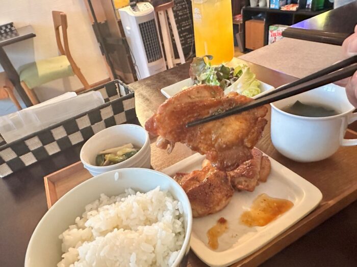 私はお店一押しのタレ漬けチキンとオレンジジュースを注文!