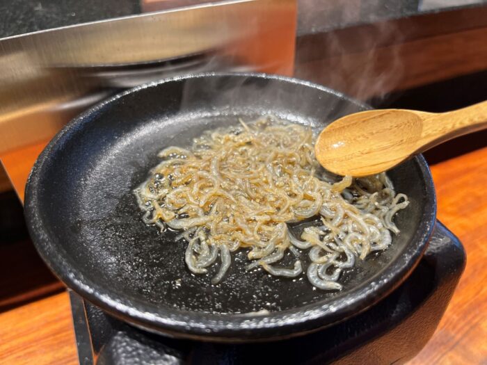 朝食メニューを注文すると、卓上の鉄板とともに「ちりめんじゃこ・お出汁・山椒だれ」が提供されます。