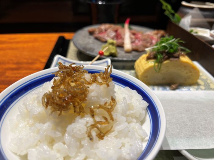 先ほど自分で仕上げた出来立てのちりめん山椒をのせると、牛肉との相性は抜群で、思わず箸が止まりません。