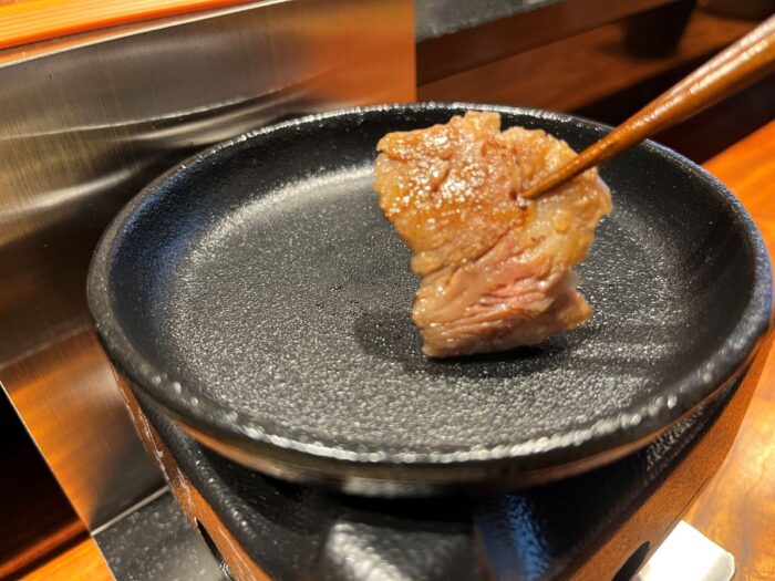 先ほどちりめん山椒を仕上げた鉄板は新しいものに変えていただき、そこで牛肉に軽く火を入れると、香ばしさが加わり、また違った表情を楽しめます。朝の時間帯に、自分のペースで仕上げるこのひと手間が、食事体験をより豊かなものにしてくれるんだな、と実感します。