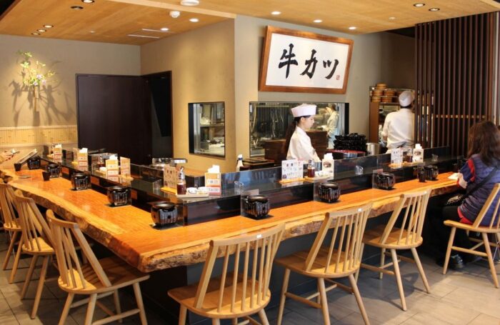 店内はテーブル席と大きなカウンター席。名物でもある「牛カツ」の文字がインパクト大!