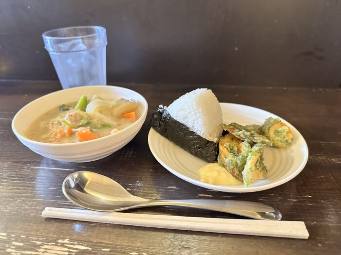 「クリームシチュー」と「おにぎり(鮭orそぼろ」そして「磯部揚げ」&オレンジジュース