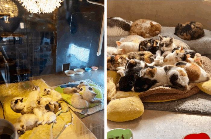 現在は総勢約50匹の猫たちが、猫部屋の中を自由気ままに行き来したりくつろいだりしている姿を、