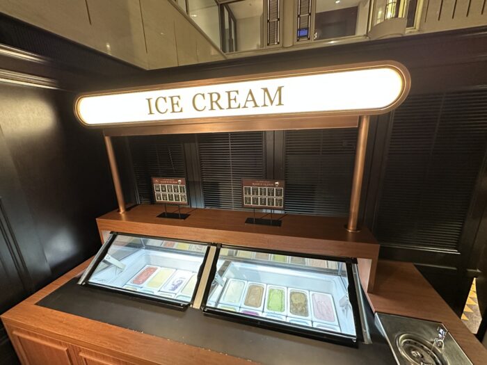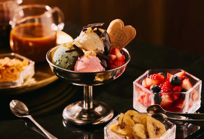 レトロ感のある”アイスクリームアトリエ”にはバニラや抹茶などの定番フレーバーの他、季節ごとに楽しめるストロベリージェラート(3月、4月)や北海道メロン(5月、6月)など多彩なアイスクリームを20種用意されています。その横にはキャラメルソースやクッキークランチなどのコンディメント20種と組み合わせ次第で数えきれないオリジナルパフェ作りを楽しめますよ。