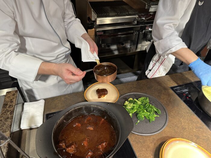 一皿一皿シェフが盛り付けて提供してくれる「和牛の赤ワイン煮込み」