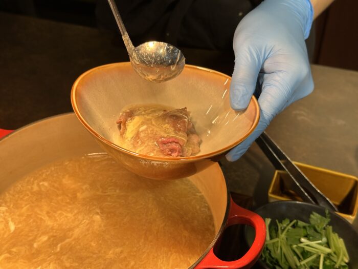 熱々の鉄板で表面を軽く焼いて、あんかけ卵を乗っけて仕上げる「和牛焼きしゃぶ 卵あんかけ」
