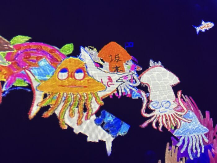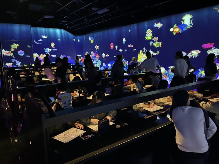 紙に描いた魚の絵がスキャンされると、大きなスクリーンの海の中へ。